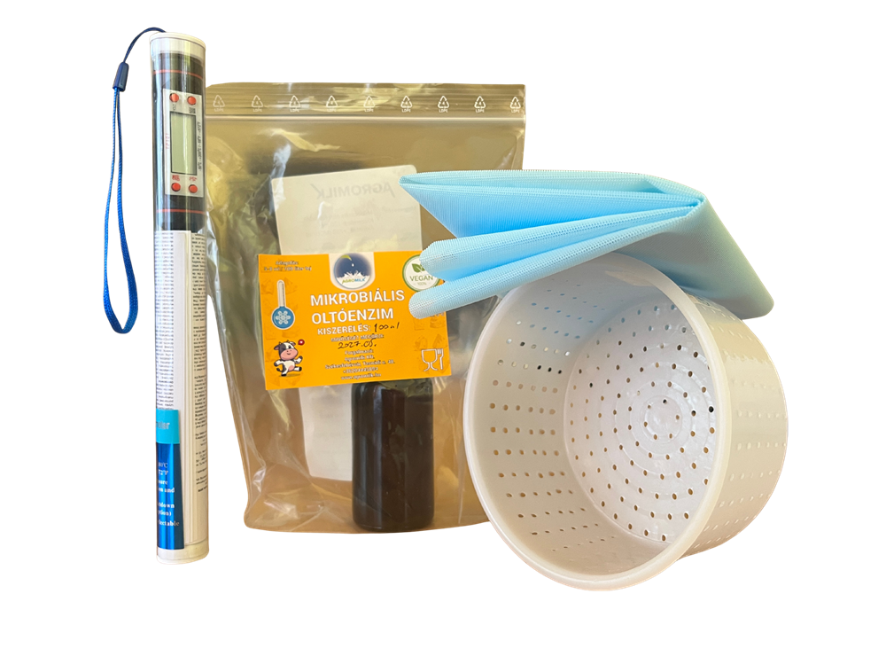 Kezdőknek szánt, átfogó sajt-készítő készlet, amely minden alap eszközt tartalmaz ahhoz, hogy otthon is el tudd készíteni a lágy és félszilárd sajtokat (pl. túró, gomolya)