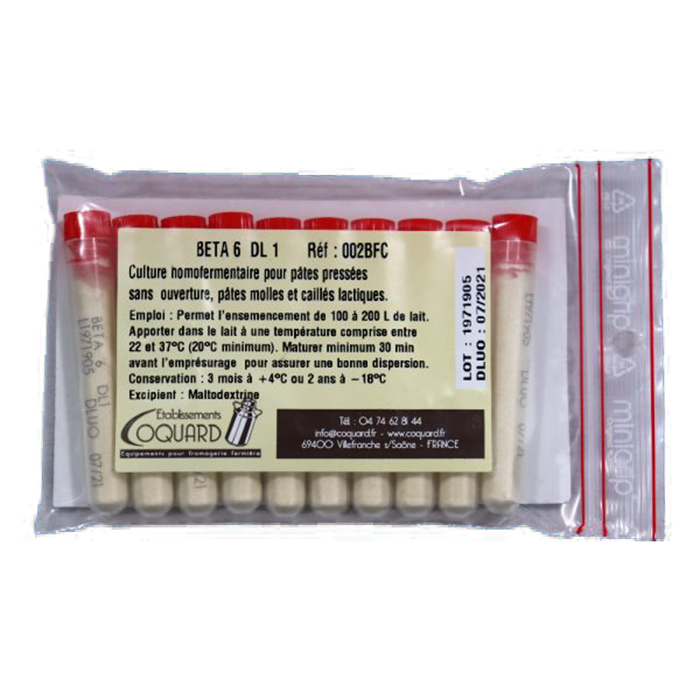 A BETA 6 DL1 egy lyophilizált (fagyasztva szárított), savasító mésophile tejsavbaktérium, amely teljesen homofermentatív, vagyis főként tejsavat termel. Ez a ferment különösen alkalmas zárt sajtok, lágy sajtok előállításához.