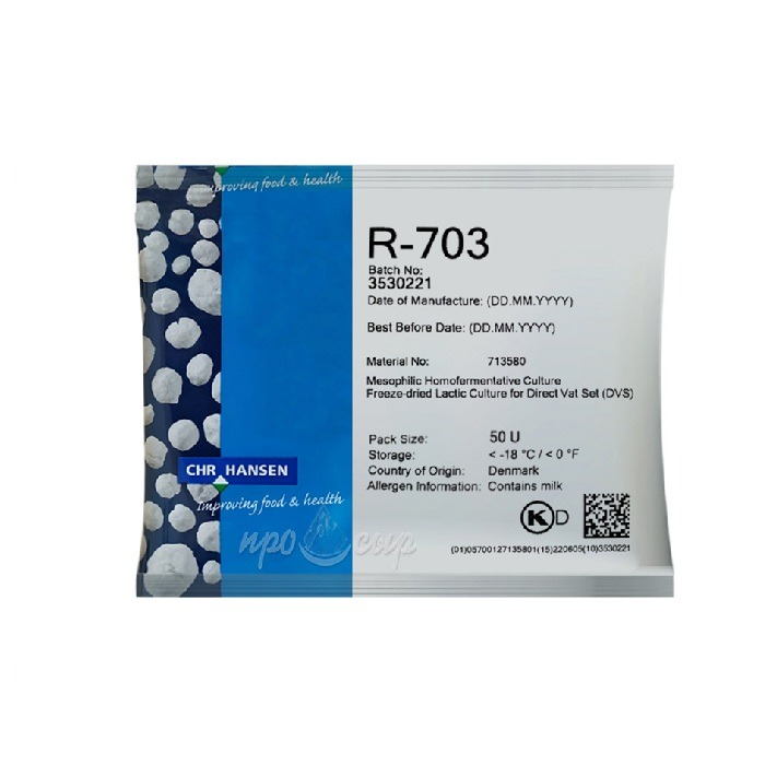 A Hansen R-703 egy speciális kultúra, amely kifejezetten zárt tésztájú, lágy és fehér sajtok, például feta készítéséhez alkalmas. Ez a baktérium-keverék biztosítja a megbízható savanyodást, kellemes ízvilágot és stabil állagot biztosít a tejtermékeknek.